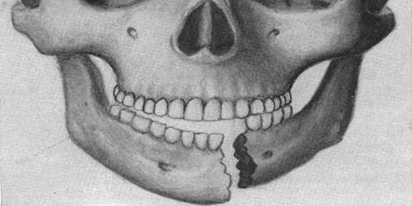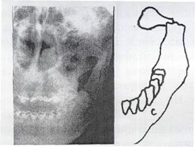 80-сурет. Төменгі жақ сүйегінің сынығы Сүйек сынықтарының ауытқуы. Төменгі жақ сүйегі сынығының негізгі клиникалық белгісі жарқыншақтардың ауытқуы болғандықтан, клиникада жиі кездесетін және орталық жіктен 3/3 тіс ұяларындағы төменгі жақ бұрыштарындағы сынықтарға назар аударамыз. Жоғарыда айтылғандай, жарқыншақтар негізінде өз салмағы және шайнау бұлшықеттерінің жиырылуы әсерінен ауытқиды. Сондықтан төменгі жақ сүйегіндегі шайнау бұлшықеттерін сипаттап өтейік. Шайнау бұлшықеттерінің көтергіш (артқы) тобы: 1. Шайнау—шықшыт бұлшықеті-сүйегі доғасының астыңғы қабаты мен жиегімен, шықшыт сүйегінен, жоғарғы жақ сүйегінің шықшыт өсіндісінен басталып төменгі жақтың үстіңгі қабатында (бұрышында) орналасқан шайнау төмпешіктеріне бекиді. Бұл ет екіжақты жиырылғанда төменгі жақты көтереді. Біржақты жиырылғанда төменгі жақты көтерумен қатар, оны сынық жағына қарай ауытқытады. 2. Самай бұлшықеті -тармақты орналасып келесі үш қабаттан тұрады: беткей, орталық және терең. Самай фасциясының ішкі қабатының жігінен, самай сүйегінен, негізгі сүйектің - үлкен қанатынан, самай беткейінен, төбе сүйектен, маңдай сүйектің қатпаршасынан, шықшыт сүйектің самай бетінен басталып төменгі жақ сүйегінің тәж тәріздес өсіндісіне бекінеді. Бұл ет жиырылғанда төменгі жақ жоғары көтеріледі. 3. Ішкі қанатша бұлшықет—негізгі сүйектің қанатша өсіндісінің екі пластинка аралығындағы шұңқырдан және жоғарғы жақ төмпешінен (сыртқы қанатша еттің басталатын жерінің сәл сыртынан) басталып, төмен, артқа, сыртқа қарай бағытталып, төменгі жақ бұрышының ішкі беткейіне бекітіледі. Бұл ет жиырылғанда төменгі жақ жоғары көтеріледі. 4. Сыртқы қанатша бұлшықет—негізгі сүйектің үлкен қанатының самайасты беткейінен, негізгі сүйектің қанатша өсіндісінің сыртқы пластинкасынан және жоғарғы жақ төмпешігінен басталады. Ет төменгі жақтың буын өсіндісіндегі қанатша шұңқырына, буын қабына, жақ буынының ішіндегі шеміршекке бекиді. Ет екіжақты жиырылса төменгі жақ көлбеу жазықтықпен солға қарай жылжиды, ал біржақты жиырылса ол қарсы жаққа қарай ауытқиды.