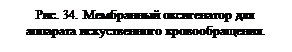 Методика подключения АИК стандартизирована. АИК заполняется стандартными растворами и кровью. Обязательно вводится гепарин. С помощью специальных канюль и соединительных трубок АИК подключается к сосудистой системе пациента. Используемые стандартные канюли подбираются соответственно антропометрическим данным пациента и измеряются в дюймах. Вначале канюлируется аорта. Как правило, канюля вводится в восходящую аорту. В редких случаях используется канюляция бедренной артерии: резекция восходящей части аорты, иногда повторные и некоторые другие операции. Восходящая аорта обходится диссектором и с его помощью проводится тесемка, которая затем берется в турникет. Далее на передней поверхности вокруг предполагаемого участка канюляции аорты накладываются два кисетных шва, с захватом только адвентиции. Затем в центре наложенных швов делается небольшой разрез аорты и в него вставляется канюля, которая фиксируется с помощью этих же швов путем затягивания турникетов. Далее канюля присоединяется к артериальной магистрали АИК. В этот момент из нее тщательно удаляется воздух. Затем, после предварительного выделения, канюлируются полые вены. Верхняя полая вена выделяется путем рассечения перикардиальной складки над правой легочной артерией. Последняя находится медиальнее от верхней полой вены. С помощью диссектора вена обходится тесемкой, которая берется в турникет. Нижняя полая вена выделяется ближе к диафрагме путем надсечения перикарда, находящего латеральнее от вены. Затем также с помощью диссектора вена обходится тесемкой. Для канюляции нижней полой вены основание ушка правого предсердия отжимается зажимом Сатинского и выше его накладывается кисетный шов. После чего иссекается верхний край ушка, и внутри его разделяются трабекулы. В качестве держалок на края оставшегося ушка накладываются два зажима или швы-держалки. Сразу же после снятия зажима Сатинского вводится канюля в правое предсердие и заводится в нижнюю полую вену. Кисетный шов вокруг нее затягивается в турникет и привязывается к канюле. Затем сразу же канюлируется верхняя полая вена. Предварительно на свободный участок правого предсердия (можно с отжатием зажимом Сатинского) накладывается другой кисетный шов, а затем аналогичным образом канюлируется верхняя полая вена. После чего обе канюли подсоединяются к венозной магистрали. При операциях аортокоронарного шунтирования и у детей грудного возраста с использованием глубокой гипотермии в правое предсердие вводится одна канюля (консоль), обеспечивающая возврат венозной крови. Из отжатых во время ИК полых вен венозная кровь путем гравитации или с помощью засасывающего насоса поступает в оксигенатор, который выполняет функцию легких (рис.33, 34). Это газообменные устройства, в котором происходит насыщение крови кислородом и удаление из него углекислоты. Раньше применялись пенопленочные многоразовые оксигенаторы и это было источником многих осложнений при операциях с ИК. Применение одноразовых пузырьковых и мембранных оксигенаторов, а также перфузионных систем не только
