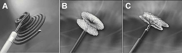 Рис. 67. Различные типы зонтиков, которые применяются для закрытия дефектов межпредсердной и межжелудочковой перегородок. Известно, что средняя продолжительность жизни не оперированных больных с ДМЖП не превышает 30 лет. Особые сложности возникают при лечении больших ДМЖП у новорожденных и грудных детей, так как у них часто возникает выраженная сердечная недостаточность, требующая интенсивного лечения. Именно у детей этой группы остается высокая летальность. Поэтому в настоящее время этим детям выполняют раннее радикальное оперативное вмешательство в условиях искусственного кровообращения. В случаях благоприятного течения порока без существенных нарушений гемодинамики дети находятся под наблюдением. В дальнейшем при сохраняющихся ДМЖП (дефекты мышечной части перегородки и небольшие мембранозные дефекты нередко самостоятельно закрываются) показано оперативное лечение. Операция проводится в условиях искусственного кровообращения на "сухом сердце". Раньше использовались различные доступы: через правое предсердие, левый желудочек, правый желудочек, легочную артерию. В 1957 году Дентон Кули впервые ушил ДМЖП доступом через вскрытое правое предсердие и разведение створок трикуспидального клапана. В настоящее время этому доступу отдается наибольшее предпочтение. В редких случаях по особым показаниям используются другие доступы. Малые дефекты до 1 см в диаметре могут быть ушиты отдельными узловыми П-образными швами с применением прокладок. В основном используется пластика дефекта с применением различного вида заплат из тефлона, дакрона или ксеноперикарда. В настоящее время операции пластики дефектов межжелудочковой перегородки хорошо разработаны и сопровождаются минимальной летальностью. Отдаленные результаты оперативного лечения благоприятные. В последние годы в клиническую практику внедрены новые эндоваскулярные методы лечения, которые позволяют закрывать дефекты межпредсердной и межжелудочковой перегородок без выполнения традиционных операций (рис. 66, 67).