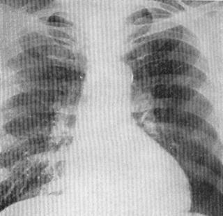Рис. 101. Рентгенограмма больного со стенозом аортального клапана. Этот шум проводится на сосуды шеи, в яремную и надключичные ямки. Для выраженного аортального стеноза характерно снижение пульсового давления. Это обусловлено тем, что систолическое давление понижено, а диастолическое давление остается нормальным. При этом пульс малый со склонностью к брадикардии. При рентенологическом обследовании имеет место, так называемая аортальная конфигурация сердца. Для нее характерно резкое увеличение левого желудочка по левому контуру с подчеркнутой талией сердца. Отмечается постстенотическое расширение восходящей аорты, четко выявляемое в левой косой проекции (рис. 101). Во время электрокардиографического исследования определяется гипертрофия левого желудочка (левограмма, увеличение зубца Р в 5-м и 6-м грудных отведениях, смещение вниз интервала ST в левых отведениях). Регистрация отрицательных зубцов Т в 1-ом и 2-ом стандартных отведениях является показателем относительной коронарной недостаточности. На фонокардиограмме фиксируется ромбовидный или веретенообразный систолический шум над аортой во втором межреберье справа. При ЭхоКГ выявляется степень сужения аортального отверстия, состояние створок, объемы полостей сердца, а также выраженная гипертрофия левого желудочка. У пациентов в возрасте старше 40 лет, страдающих аортальным стенозом, показано проведение коронарографии для исключения ИБС. Хирургическое лечение аортального стеноза должно осуществляться по принципу: не раньше, чем нужно и не позже чем необходимо. При этом учитывается степень стеноза, клиника, функциональный класс. В 3-ем и 4-ом классах операция абсолютно показана. Наличие хотя бы одного из триады признаков (обмороки, сердечная астма, ангинозные боли) служит прямым показанием к оперативному лечению. Кардиомегалия, выраженные электрокардиографические признаки гипертрофии левого жедудочка, систолический аортальный градиент более 50 мм рт.ст., даже при незначительных жалобах и невыраженной клинике, являются показаниями к операции. Проводится протезирование аортального клапана в условиях искусственного кровообращения. Существует группа больных с аортальным стенозом, относящихся к 4-му функциональному классу по NYHA с застойной сердечной недостаточностью, рефрактерной к медикаментозному лечению, у которых риск операции крайне высокий. Эти пациенты считаются неоперабельными. Известно, что при тотальной сердечной недостаточности продолжительность их жизни составляет 7-8 месяцев. К тому же остается высоким риск внезапной смерти. У ряда этих больных, как единственно возможный вариант вмешательства на данном этапе, можно выполнить катетерную баллонную вальвулопластику для декомпрессии левого желудочка. Применяется методика "дробного" расширения аортального отверстия с использованием катетеров типа "Meadox" или "Schnieder medintug", а также – одномоментного расширения баллонными катетерами диаметром 23-28 мм. В случаях успешности вальвулопластики увеличивается площадь аортального отверстия, снижается градиент давления, а также конечное диастолическое давление в левом желудочке и увеличивается фракция выброса. Главными достоинствами баллонной вальвулопластики является, то, что у ряда больных отмечается выраженное клиническое улучшение и они переводятся в 3