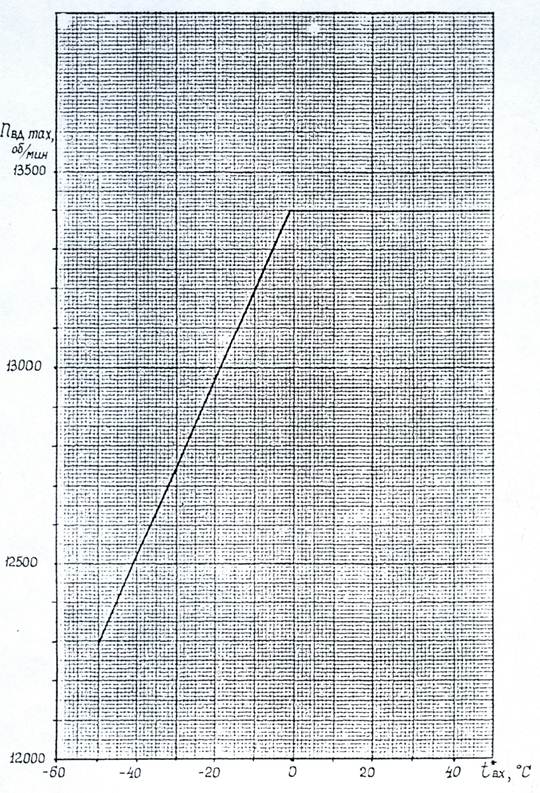 Експрес-контроль При цьому контролі критерієм оцінки технічного стану ГТД є частоти обертання роторів високого тиску (n вд изм) і вільної турбіни (n ст изм). Для проведення контролю необхідно: · виміряти температуру повітрі на вході у двигун ( · визначити максимальну частоту обертання ротора високого тиску застосовуючи графічну залежність · порівняти n вд изм з · записати результати контролю у добову відомість.