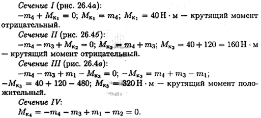 3. Строим эпюру крутящих моментов. Заметим, что скачок на эпюре всегда численно равен приложенному вращающему моменту. Выбираем соответствующий масштаб. Откладываем значения моментов, штрихуем эпюру поперек, обводим по контуру, записываем значения моментов (см. эпюру под схемой вала (рис. 26.3)). Максимальный крутящий момент на участке III Мкз = 320 Н*м.