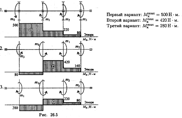 Примечание. Меняя местами колеса (шкивы) на валу, можно изменять величины крутящих моментов. Рациональным расположением является такое, при котором крутящие моменты принимают минимальные из возможных значения.