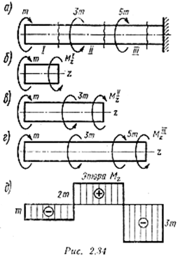 И в этом случае выбранное направление MIIz соответствует действительному. В любом сечении участка II крутящий момент MzII = 2m. Согласно принятому правилу знаков, MzII положителен и ординаты эпюры откладываем вверх от ее оси. 3. Проводим произвольное поперечное сечение на участке III и составляем уравнение равновесия для оставленной части бруса, изображенной отдельно на рис. 2.34, г: