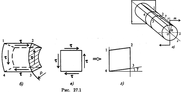 При кручении возникает напряженное состояние, называемое «чистый сдвиг» (рис. 27.1 б). При сдвиге на боковой поверхности элемента 1234 возникают касательные напряжения, равные по величине (рис. 27.1в), элемент деформируется (рис. 27.1 г).