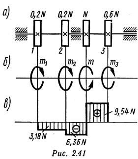 Расчетная схема вала показана на рис. 2.41, б. На рис. 2.41, в представлена эпюра крутящих моментов. Расчетный (максимальный) крутящий момент Mz = 9,54 N. Условие прочности
