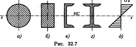 Сравним моменты сопротивления двух сечений одинаковой площади: двутавра (рис. 32.7г) и круга (рис. 32.7а). Двутавр № 10 имеет площадь 12 см2, осевой момент инерции 198см4, момент сопротивления 39,7см3. Круг той же площади имеет диаметр момент инерции Jx = 25,12см4, момент сопротивления Wx = 6,2см3.