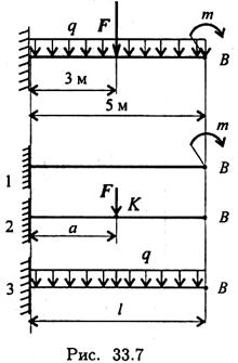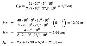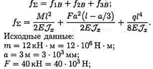 Используем принцип независимости действия сил. По приведенным в таблице формулам рассчитываем прогиб балки в точке от каждого вида нагружения отдельно (рис. 33.7 (1, 2, 3)). Поскольку все действующие нагрузки прогибают балку вниз, результаты действия нагрузок можно сложить. Полученный суммарный прогиб сравним с допускаемым прогибом. Допускаемый прогиб