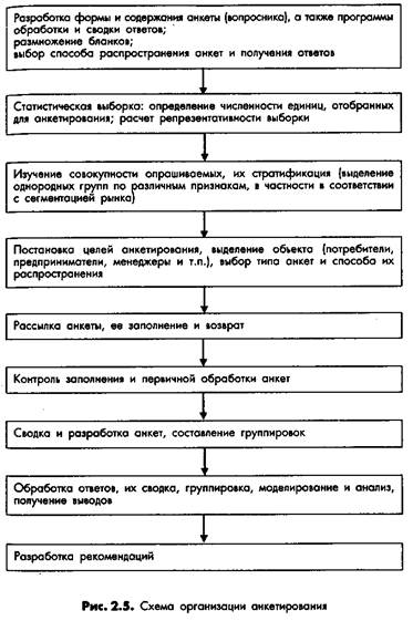 Что касается последовательности представления вопросов в анкете, то не рекомендуется начинать вопросник с трудных или персональных вопросов или с вопросов, не интересных для респондентов; такие вопросы рекомендуется ставить в середине или в конце анкеты. Первый вопрос должен заинтересовать опрашиваемых. Желательно, чтобы вопросы излагались в определенной логической последовательности, позволяющей как можно полнее рассматривать отдельные темы. Переход к следующей теме следует начинать с некоторой вступительной фразы. Вопросник не должен содержать вопросы, на которые не захотят отвечать, невозможно ответить или не требуют ответа. Иногда можно получить желаемую информацию с помощью косвенных вопросов. Так, вместо того чтобы задать прямой вопрос о доходах респондента, спрашивают, к какой социальной группе он себя относит (к высокообеспеченному населению, обеспеченному, среднеобеспеченному, низкообеспеченному и т. п.). Формулировка вопросов - сложная и трудоемкая работа, требующая высокой квалификации, знания экономики, статистики и социометрии, определенных литературных способностей. Несмотря на то что существуют единые принципы анкетирования, невозможно механически копировать имеющиеся образцы. Особое внимание следует обращать на оформление анкеты, которое иногда оказывается неудачным, неудобным: смысловые блоки не отделены друг от друга, выбран плохо читаемый шрифт, не предусмотрено место для кодов и т.п. Если вовремя не обратить внимание на эти факторы, работа интервьюера, а затем кодировщика, оператора будет затруднена и может даже привести к ошибкам. Серьезной проблемой может оказаться рассылка/раздача анкет. Во время выставок-продаж, в зале магазина, на улице и т.п. анкеты раздаются всем желающим с просьбой заполнить их на месте и вернуть любому из служащих. По существу это случайная, бесповторная выборка, характеристики которой будут определены после возвращения анкет. Естественно, эти анкеты должны включать минимум вопросов и быть простыми по содержанию. Очень часто анкетирование проводят во время пробного маркетинга. Иногда анкета вкладывается в виде отрывного ярлыка в какое-либо популярное издание. Если вы имеете хорошие связи с руководством некоего предприятия или учреждения, то оно может содействовать вам в распространении анкеты среди своих работников. Широко используемый способ - раскладка анкет по почтовым ящикам (возможно, по договоренности с почтальоном). Обычно в этом случае применяется или механическая выборка (например, каждый десятый адресат), или серийная (отбираются дома, в которых осуществляется сплошная раздача анкет). В любом случае надо предусмотреть возможность невозвращения анкет (до 50% от общего числа). Возврат анкет по почте заранее оплачивается. Учитывая, что разработка анкет - творческая задача, ее план составляется заранее и обсуждается, увязывается с общими задачами и целями маркетингового исследования. Следующая схема отражает определенную последовательность действий в процессе анкетирования (рис.2.5). Затраты на анкетирование достаточно высоки. Так, по данным консалтинговой фирмы McKinsey and Company, эти затраты зависят от числа респондентов (табл. 2.7).