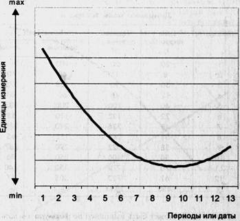 В графической форме подобная Трендовая модель показана на рис. 4.9. Тенденция к сокращению параметров рынка (спад) отражается каждой из рассмотренных функций в зависимости от характера изменения. При этом меняются знаки в уравнениях - с плюса на минус.