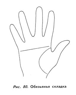 очень упорны, обладают прекрасной памятью, их эмоциональный мир всегда очень сложен и напряжен. Эти люди рациональны и логичны в дискуссиях, но, приняв решение или составив мнение по тому или иному вопросу, они отказываются обсуждать его далее. Если обезьянья складка присутствует на второстепенной руке, это говорит о том, что человек провел безоблачное детство и не любит брать на себя ответственность. У него в жизни есть только один интерес, которому он с невероятным упорством будет отдавать все свое время и силы. Если обезьянья складка присутствует на главной руке, это указывает на человека принципиального, редко меняющего свои убеждения и обладающего большими физическими потребностями. Он не умеет расслабляться и скорее всего многого добьется в жизни благодаря своему упорству. Если обезьянья складка присутствует на обеих руках, это выдает человека, всегда и во всем следующего собственным путем и не нуждающегося в помощи окружающих. Он упрям, настойчив и неутомим. На грубой руке при отсутствии каких-либо благоприятных знаков обезьянья складка может указывать на то, что человек будет вовлечен в преступную деятельность. Если на ладони имеются благоприятные знаки, это говорит о том, что человек вложит всю свою неистощимую энергию в построение карьеры, или в победы на спортивных соревнованиях, или в другие виды физической активности. Обезьянья складка часто встречается на руках больных, страдающих синдромом Дауна, однако подавляющее большинство людей, наделенных ею, совершенно нормальны и, как правило, отличаются высоким Уровнем интеллекта.