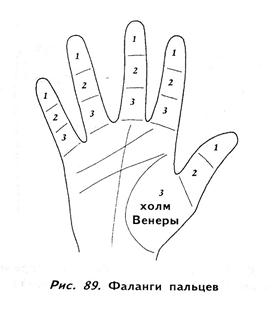Каждый палец на руке человека разделен на три части, которые называются фалангами (рис. 89), хотя создается впечатление, что большой палец имеет лишь две фаланги. Холм Венеры — мясистый участок руки у основания большого пальца, опоясанный линией жизни,— и есть его третья фаланга.
