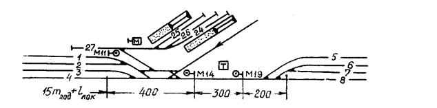 Под обработкой грузового двора понимается ряд операций, связанных с обслуживанием погрузочно-разгрузочных фронтов на грузовом дворе. К таким операциям относятся: подача вагонов под выгрузку или погрузку, перестановка порожних от фронта выгрузки к фронтам погрузки, уборка груженых или порожних от фронтов погрузки, выгрузки. Продолжительность каждой из этих операций складывается из затрат времени на отдельные передвижения (полурейсы) и элементы. Подача вагонов под выгрузку. Вагоны в адрес грузового двора поступают в процессе роспуска на первый путь сортировочного парка согласно специализации путей. С этого пути они подлежат подаче на 24-й путь, где имеется три фронта выгрузки; крытый пакгауз, платформа для навалочных грузов и платформа для выгрузки техники. Поэтому перед подачей вагонов их нужно подформировывать в порядке расположения грузовых фронтов. Продолжительность подачи складывается из затрат времени на следующие элементы: подформирование на вытяжке; следование на путь 27 (рис. 10); следование на путь выгрузки; расстановка вагонов по фронтам выгрузки; следование локомотива обратно на 27 путь; следование локомотива на вытяжной путь.