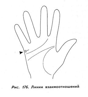 ДЕТИ ЛЮБОВЬ Помимо линии жизни, многим людям известно значение и тонких мелких линий, горизонтально расположенных на ребре ладони между основанием мизинца и линией сердца (рис. 176). Эти линии часто неверно называют супружескими линиями. В действительности они именуются линиями взаимоотношений, и благодаря им можно определить, сколько важных любовных союзов будет в жизни человека. Воз У большинства людей можно обнаружить одну, две, три или четыре линии взаимоотношений. Они толкуются снизу вверх, от линии сердца к пальцу Меркурия. Любовный союз можно считать постоянным, что часто, но не всегда ведет к браку, если символизирующая его линия огибает ребро ладони и заканчивается на самой ладони. Если линия не доходит до середины ребра ладони, это говорит о том, что любовный союз будет недолговечным. Главная трудность, с которой может столкнуться хиромант при анализе линий взаимоотношений, заключается в том, что если прочный любовный союз по каким-то причинам разрывается, а потом восстанавливается, на руке это отражается в виде двух линий, несмотря на то, что партнер остался тем же, что и прежде. Все еще больше усложняется из-за того, что двойная линия символизирует возможное, но не обязательно реальное воссоединение.