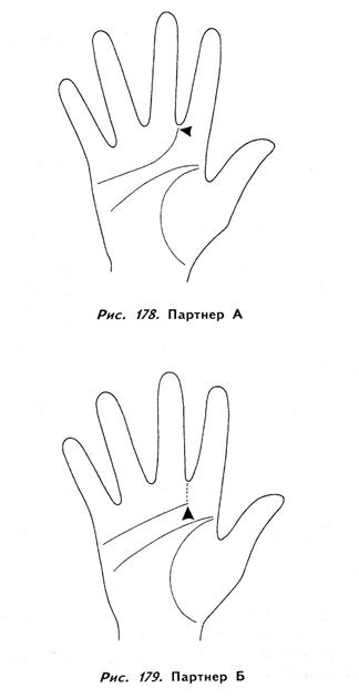 Разобравшись с формами рук, переходим к точке окончания линий сердца. Линии сердца на руках обоих партнеров должны иметь приблизительно одинаковую форму и заканчиваться на одном и том же участке руки. Помните, если у одного из партнеров линия сердца имеет цепочечную структуру, это означает, что он пережил много разочарований в любви и отдаться целиком новой любви сможет только после того, как будет в ней уверен. В идеале линии сердца должны заканчиваться между пальцами Сатурна и Юпитера. Это говорит о том, что в любви партнеры выдвигают реальные требования и не ждут совершенства и непогрешимости друг от друга. Если у обоих партнеров линии сердца заканчиваются на холме Юпитера, это означает, что оба они являются идеалистами и пережили немало разочарований в любви. Все гораздо сложнее, если только у одного партнера линия сердца заканчивается на холме Юпитера, поскольку это говорит о том, что он будет постоянно недоволен несовершенством возлюбленного (возлюбленной). Если у одного из партнеров линия жизни заканчивается на холме Сатурна, он будет эгоистичен и поглощен только собственными желаниями и потребностями. Довольно трудно представить гармоничные взаимоотношения между людьми, линии сердца на руках которых заканчиваются на холме Сатурна. Если один из партнеров обладает духовной линией сердца, а другой — физической, необходимо обратить внимание на то, где эти линии заканчиваются (рис. 178, 179). Например, физическая линия сердца может заканчиваться между пальцами Сатурна и Юпитера, а духовная — на точке, расположенной на одной прямой, но чуть ниже точки, отмечающей середину расстояния между этими пальцами. Это подтверждает совместимость партнеров, однако духовная линия сердца говорит о романтической любви и о трудности в выражении мыслей и чувств, физическая же линия указывает на человека более практичного и в большей степени наделенного собственническим инстинктом. Партнер с духовной линией сердца нуждается в цветах, подарках и постоянных доказательствах любви. В таком союзе партнерам придется часто идти на компромисс.
