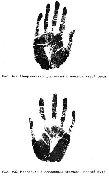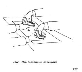 Вам потребуются листы картона или качественного плотного ватмана размером 20x30 см или больше. Также понадобится тюбик чернил для рисования на водной основе, которые легко смываются водой с мылом. Художники часто используют такие чернила для литографий, поэтому их легко найти в любом специализированном магазине. Там же вы сможете приобрести валик для нанесения чернил шириной приблизительно 10 см. Вам также потребуется пружинистая поверхность, на которую можно положить ватман. Я лично использую в этих целях банные полотенца, сложенные пополам. Изначально я приспособил для этого старый резиновый коврик, который ранее лежал под печатной машинкой. В принципе неважно, что вы подложите под ватман, главное, чтобы поверхность была слегка пружинистой, поскольку это позволяет снимать отпечаток ладонной впадины. Итак, поместите лист ватмана на выбранную вами поверхность. Выдавите из тюбика немного чернил на осколок стекла либо на кусочек бумаги. Раскатайте их валиком так, чтобы весь он был покрыт равномерным слоем. Попросите клиента снять кольца и протянуть вам ладони. Равномерными, длинными мазками покройте его руки тонким слоем чернил. Попросите клиента расслабить руки, а потом одновременно прижать их ладонями вниз к листу ватмана (рис. 186). После этого осторожно надавите на них сверху так, чтобы на ватмане отпечаталась ладонная впадина (рис. 187, 188). Придерживая лист ватмана за края, попросите клиента поднять руки прямо и вверх. Затем сделайте отдельные отпечатки больших пальцев, поскольку на полном отпечатке руки отображается только часть большого пальца. Если ваш клиент наделен особенно высоким холмом Венеры или Луны, сделать полный отпечаток будет непросто (рис. 189, 190). В подобных случаях я прошу человека слегка приподнять руки, после чего осторожно вдавливаю бумагу в ладонные впадины.