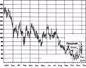 Позиция была ликвидирована, когда краткосрочное поведение цен стало указывать на возможность разворота. В частности, в день закрытия позиции произошел пробой модели флага в направлении, противоположном ожидаемому, и, кроме того, это был широкодиапазонный день с ростом цен. Исходя из дневного штрихового графика, иллюстрирующего открытие позиции (рис. 14.4а), можно было сделать два следующих равновероятных предположения: господствующий торговый диапазон представляет собой двойное дно; и, напротив, он является паузой в незаконченной понижательной тенденции. Однако долгосрочный недельный график (не показан) явно свидетельствовал в пользу последней интерпретации. Отсюда вывод: чтобы составить общее представление о ситуации, желательно вначале изучить долгосрочный график, а потом переходить к более коротким временным масштабам. (Термины долгосрочный и краткосрочный являются субъективными. Для одних трейдеров долгосрочный означает недельный или месячный, а краткосрочный -дневной; для других - долгосрочный может означать дневной, а краткосрочный - внутридневной.) ГЛАВА 14. графический анализ в реальной жизни 331 Что касается ликвидации позиции, то хотя день закрытия в конечном счете не ознаменовал разворота, тем не менее причины для ликвидации были вполне вескими, особенно принимая во внимание значительное движение цен в благоприятном направлении, реализованное в ходе сделки, повышающее вероятность по крайней мере промежуточной коррекции. И действительно, снижение продолжалось недолго, а затем цены поднялись выше уровня закрытия позиции (рис. 14.5а) Рисунок 14.5а. КАЗНАЧЕЙСКИЕ ОБЛИГАЦИИ, НЕПРЕРЫВНЫЕ ФЬЮЧЕРСЫ