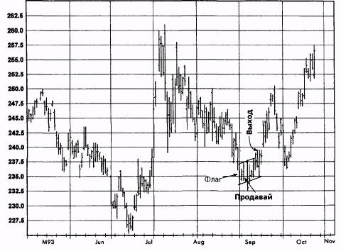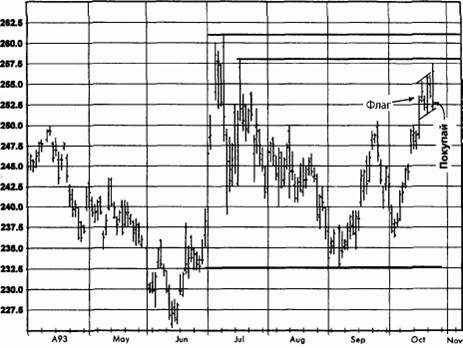 Пробой флага в направлении, противоположном ожидаемому, указывал на то, что произошел разворот вверх. Выход при первом признаке нарушения исходной предпосылки минимизировал убыток несмотря на то, что предпосылка сделки была ложной. ГЛАВА 14. графический анализ в реальной жизни 429 Рисунок 14.54а. КУКУРУЗА, ДЕКАБРЬ 1993