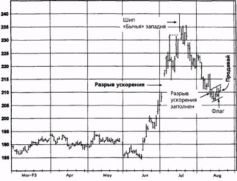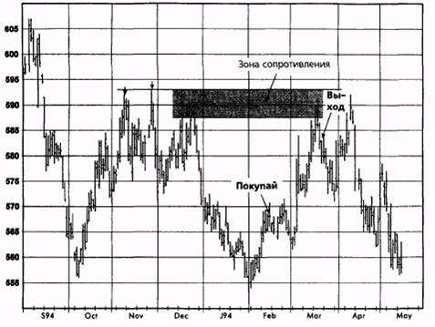 Защитная остановка была перемешена близко к рыночным ценам, поскольку рынок достиг зоны сильного сопротивления, обусловленного прошлыми относительными максимумами (обозначено стрелками вниз). Причина выхода из этой позиции очень похожа на ту, которая была в предыдущей сделке, за исключением того, что здесь в той же самой ситуации была резко ужесточена защитная остановка (в противоположность автоматической ликвидации позиции). В общем, оба способа закрытия позиции равнозначны. Их отличие заключается лишь в том, что ужесточение защитной остановки иногда позволяет сохранить позицию до дальнейшего значительного продолжения тренда при риске ее ликвидации по немного худшей цене. ГЛАВА 14. графический анализ в реальной жизни 453 Рисунок 14.66а. СОЕВАЯ МУКА, ДЕКАБРЬ 1993