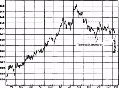 Закрытие позиции Страницу. Причины открытия позиции Образование модели вымпела дало возможность нарастить имеющуюся короткую позицию, используя сравнительно близкую остановку. (Мотивы первоначального открытия позиции изложены в описании предыдущей сделки.) Основной идеей было открыть позицию внутри вымпела в предвкушении его пробоя вниз, поскольку предыдущее движение рынка было понижательным. Вымпел позволил удвоить позицию с весьма умеренным увеличением риска, поскольку обоснованная остановка могла быть размещена сразу над моделью. Вы согласны или не согласны с анализом? Оцените ситуацию перед тем, как переворачивать 528 ЧАСТЬ 2. графический анализ в реальной жизни Рисунок 14.1036. ПИБОР, ДЕКАБРЬ 1993