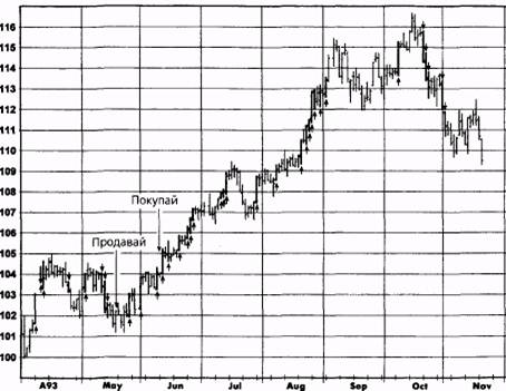 Замечания: Жирные штрихи обозначают дни с ускорением. Направление стрелок указывает направление ускорения дня. Показанные сигналы к покупке и продаже сгенерированы при N2 = 3 и не имеют аналогов при N2 = 4. Рисунок 18.11. СИСТЕМА ПРОБОЯ ДНЯ С УСКОРЕНИЕМ (N2 = 3), ГРАФИК 2: НЕПРЕРЫВНЫЕ ФЬЮЧЕРСЫ НА КАЗНАЧЕЙСКИЕ ОБЛИГАЦИИ