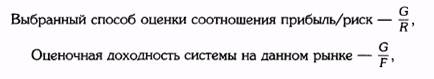 где G — средний годовой доход на контракт, R — выбранная мера риска (например, sd, AMR, ML), F — общие активы, выделенные для торговли. Единственный практический способ оценить F — рассматривать ее как функцию риска. Наиболее прямо F может оцениваться как выбранная мера риска, умноженная на некий коэффициент. То есть F = kR, где k — множитель меры риска (определяемый субъективно). Таким образом, оценочный процент прибыли системы мог бы быть выражен как