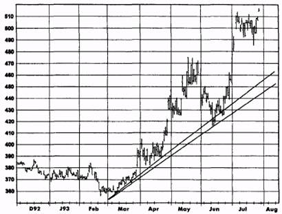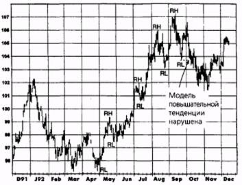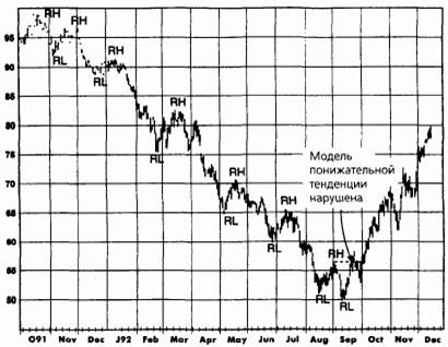 Примечание: RH - относительный максимум; RL — относительный минимум. Рисунок 3.4. ЛИНИЯ ПОВЫШАТЕЛЬНОГО ТРЕНДА: СЕРЕБРО, ИЮЛЬ 1993
