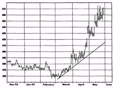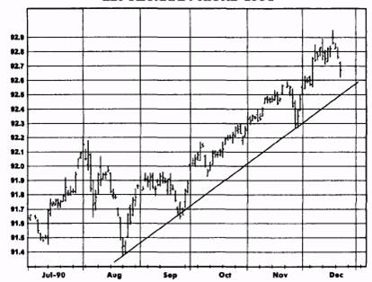 Рисунок 3.12. КОРРЕКТИРОВКА ЛИНИИ ПОВЫШАТЕЛЬНОГО ТРЕНДА: ЕВРОДОЛЛАР, ИЮНЬ 1991