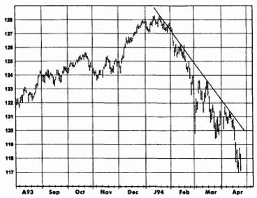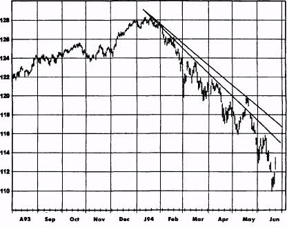 52 ЧАСТЬ 1. анализ графиков Рисунок 3.13. КОРРЕКТИРОВКА ЛИНИИ ПОНИЖАТЕЛЬНОГО ТРЕНДА: НЕПРЕРЫВНЫЕ ФЬЮЧЕРСЫ НА ИНДЕКС ФРАНЦУЗСКИХ ОБЛИГАЦИЙ НА БИРЖЕ MATIF