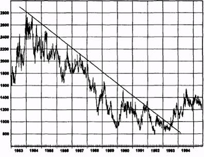 * MA77F (Marche a Terme International de France) — Французская международная товарная и фьючерсная биржа, — Прим. ред. Рисунок 3.7. ЛИНИЯ ПОНИЖАТЕЛЬНОГО ТРЕНДА: БЛИЖАЙШИЕ ФЬЮЧЕРСНЫЕ КОНТРАКТЫ НА КАКАО