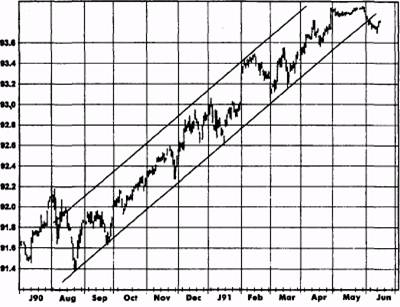 Рисунок 3.9. ПОВЫШАТЕЛЬНЫЙ ТРЕНДОВЫЙ КОРИДОР: ЕВРОДОЛЛАР, ИЮНЬ 1991