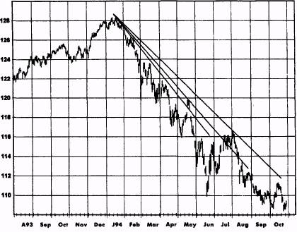 более высоких максимумов осталась ненарушенной даже после июньского пробоя линии тренда. Аналогичным образом, рис. 3.12 идентичен рис. 3.5 с той лишь разницей, что изображаемый период продолжен на пять месяцев. Нижняя линия на рис. 3.12 представляет линию повышательного тренда, которую можно было бы нанести, опираясь на новые данные. Верхняя линия воспроизводит трендовую линию рис. 3.5, построенную на информации, имевшейся до января. Январский пробой этой линии не привел к развороту тенденции, а просто сделал необходимой корректировку трендовой линии. На рис. 3.13 представлен аналогичный пример для понижательной линии тренда. Этот рисунок идентичен рис. 3.6 за исключением того, что изображаемый период продолжен на два месяца. Верхняя линия на рис. 3.13 представляет понижательную линию тренда, которую можно было бы нанести, опираясь на новые данные. Нижняя линия воспроизводит трендовую линию рис. 3.6, построенную на информации, имевшейся до мая. Майский пробой этой линии не привел к развороту тенденции, а просто сделал необходимой корректировку трендовой линии. ГЛАВА 3. тенденций 53 Рисунок 3.14. ДВОЙНАЯ КОРРЕКТИРОВКА ЛИНИИ ПОНИЖАТЕЛЬНОГО ТРЕНДА: НЕПРЕРЫВНЫЕ ФЬЮЧЕРСЫ НА ИНДЕКС ФРАНЦУЗСКИХ ОБЛИГАЦИЙ НА БИРЖЕ MATIF