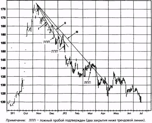 Как было детально показано в гл. 6, разрывы принято считать моделями, предвещающими продолжение тенденции в направлении разрыва. Когда разрыв заполняется, то это квалифицирует его как несработав- Рисунок 11.8. НЕСКОЛЬКО ЛОЖНЫХ ПРОБОЕВ ЛИНИЙ ПОНИЖАТЕЛЬНОГО ТРЕНДА: КОНЦЕНТРАТ АПЕЛЬСИНОВОГО СОКА, ИЮЛЬ 1992