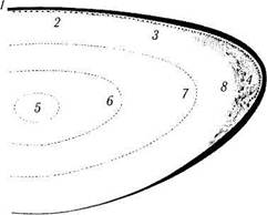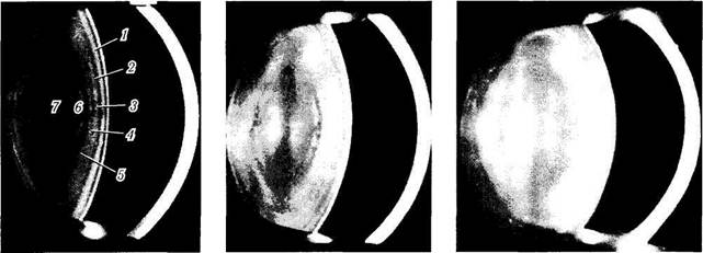 а 6 6 Рис. 3.4.3. Послойность строения хрусталика при биомикроскопическом его исследовании у индивидуумов различного возраста (по Bron et al., 1998): а — возраст 20 лет; б — возраст 50 лет; s — возраст 80 лет (/ — капсула; 2 — первая кортикальная светлая зона (С1 альфа); 3 — первая зона разобщения (С1 бета); 4 — вторая кортикальная светлая зона (С2): 5 — рассеивающая свет зона глубокой коры (СЗ); 6 — светлая зона глубокой коры; 7 — ядро хрусталика. Отмечается увеличение хрусталика и усиление рассеивания света Хрусталик и ресничный поясок (зонулярный аппарат)