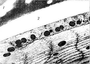 Рис. 3.4.8. Светооптическое строение капсулы хрусталика, эпителия капсулы хрусталика и хрусталиковых волокон наружных слоев: / — капсула хрусталика; 2 — эпителиальный слой капсулы хрусталика; 3 — хрусталиковые волокна Ультраструктурно капсула имеет относительно аморфное строение (рис. 3.4.6, 3.4.9). Незначительная пластинчатость намечается благодаря рассеиванию электронов нитевидными элементами, складывающимися в пластины. Выявляется около 40 пластин, толщина каждой из которых равна приблизительно 40 нм [1197]. При большем увеличении микроскопа выявляются нежные коллагеновые фибриллы диаметром 2,5 нм [798]. В постнатальном периоде происходит некоторое утолщение задней капсулы, что свиде-