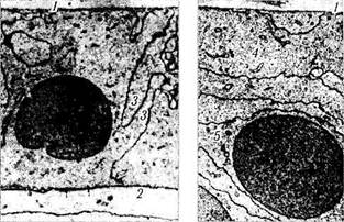Рис. 3.4.10. Ультраструктурная организация эпителиальных клеток капсулы хрусталика промежуточной зоны (а) и экваториальной области (б) (по Hogan et al., 1971): 1 — капсула хрусталика; 2 — апикальная поверхность соседней эпителиальной клетки; 3 —пальцевые вдавления в цитоплазму эпителиальной клетки соседних клеток; 4 — эпителиальная клетка, ориентированная параллельно капсуле; 5 — ядросодер-жащая эпителиальная клетка, расположенная в коре хрусталика поверхности клеток большого размера и имеют многочисленные ядерные поры. В них, как правило, два ядрышка. Цитоплазма эпителиоцитов содержит умеренное количество рибосом, полисом, гладкий и шероховатый эндоплазматический ретикулум, маленькие митохондрии, лизосомы и гранулы гликогена. Выражен аппарат Гольджи. Видны цилиндрической формы микротрубочки диаметром 24 нм, микрофиламенты промежуточного типа (10 нм), филаменты альфа-актинина [798]. При помощи методов иммуноморфологии в цитоплазме эпителиоцитов доказано наличие так называемых матричных белков — актина, винметина, спектрина и миозина, которые обеспечивают жесткость цитоплазмы клетки [52, 54, 86, 107, 798, 867]. В эпителии присутствует также альфа-крис-таллин. Бета- и гамма-кристаллины отсутствуют. К капсуле хрусталика эпителиоциты присоединены при помощи полудесмосом [839]. Между эпителиоцитами видны десмосомы и щелевые контакты, имеющие типичное строение (см. главу 1) [858]. Система межклеточных контактов обеспечивает не только сцепление между эпителиальными клетками хрусталика, но определяет ионную и метаболическую связь между клетками. Несмотря на наличие многочисленных межклеточных контактов между эпителиальными клетками, существуют пространства, выполен-ные бесструктурым материалом низкой электронной плотности. Ширина этих пространств колеблется от 2 до 20 нм. Именно благодаря этим пространствам осуществляется обмен метаболитов между хрусталиком и внутриглазной жидкостью. Глава 3. СТРОЕНИЕ ГЛАЗНОГО ЯБЛОКА