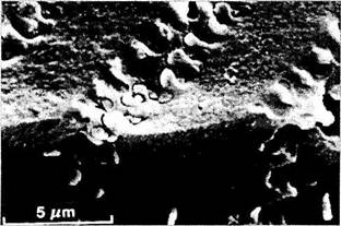 В процессе образования хрусталикового волокна в цитоплазме клеток появляются многочисленные микротрубочки диаметром 5 нм [686, 863] и промежуточные фибриллы [686, 687], ориентированные вдоль клетки и играющие важную роль в морфогенезе хрусталико-вых волокон [759, 798, 827]. Клетки различной степени дифференциации в области ядерной дуги располагаются как бы в шахматном порядке. Благодаря этому между ними образуются каналы, обеспечивающие строгую ориентацию в пространстве вновь дифференцирующихся клеток. Именно в эти каналы проникают цитоплазматические отростки. При этом образуются меридианальные ряды хрусталиковых волокон. Важно подчеркнуть, что нарушение мериди-анальной ориентации волокон является одной из причин развития катаракты как у экспериментальных животных [1188, 1190, 1191], так и у человека [1050, 1104]. Превращение эпителиоцитов в хрусталико-вые волокна происходит довольно быстро. Это было показано в эксперименте на животных с использованием тимидина, меченного изотопом [148, 439, 732, 736, 1189]. У крыс эпителиоцит превращается в хрусталиковое волокно спустя 5 недель. В процессе дифференциации и смещения клеток к центру хрусталика в цитоплазме хрусталиковых волокон уменьшается количество органоидов и включений. Цитоплазма приобретает гомогенный вид. Ядра подвергаются пик-нозу, а затем и полностью исчезают [550, 631, 1141]. Вскоре исчезают органоиды [96, 97, 550, 749, 750, 798, 815]. Basnett [96, 97] выявил, что потеря ядер и митохондрий наступает внезапно и в одном поколении клеток. Количество хрусталиковых волокон на протяжении жизни постоянно увеличивается. «Старые» волокна смещаются к центру. В результате этого формируется плотное ядро. С возрастом уменьшается интенсивность образования хрусталиковых волокон. Так, у молодых крыс в сутки формируется приблизительно пять новых волокон, в то время как у старых крыс —одно [148, 439, 736]. Особенности мембран эпителиальных клеток. Цитоплазматические мембраны соседних эпителиальных клеток формируют своеобразный комплекс межклеточных связей. Если боковые поверхности клеток слегка волнистые, то апикальные зоны мембран образуют «пальцевые вдавления», погружающиеся в надлежащие хрусталиковые волокна. Базальная часть клеток присоединена к передней капсуле при помощи полудесмосом, а боковые поверхности клеток соединяются десмосомами. На боковых поверхностях мембран смежных клеток обнаружены также щелевые контакты, через которые может происходить обмен небольшими молекулами между хрусталиковыми волокнами [96, 97, 629, 858]. В области щелевых контактов обнаруживаются белки кенне-сины различной молекулярной массы [1071]. Некоторые исследователи предполагают, что щелевые контакты между хрусталиковыми волокнами отличаются от таковых в других органах и тканях. Исключительно редко можно увидеть плотные контакты [620, 664, 666]. Структурная организация мембран хрусталиковых волокон и характер межклеточных контактов свидетельствуют о возможном наличии на поверхности клеток рецепторов, контролирующих процессы эндоцитоза, который имеет большое значение в перемещении метаболитов между этими клетками [156]. Предполагается существование рецепторов к инсулину, гормону роста и бета-адренергическим антагонистам. На апикальной поверхности эпителиальных клеток выявлены ортогональные частицы, встроенные в мембрану и имеющие диаметр 6