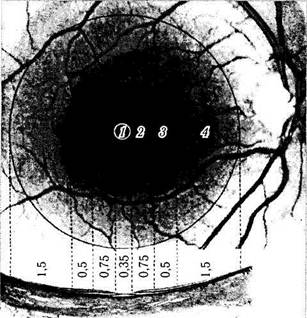 Рис. 3.6.47. Офтальмоскопический вид глазного дна (вверху) и соответствие его структур особенностям микроскопического строения сетчатой оболочки (внизу) (по Hogan et ai, 1971): I — ямочка; 2 — центральная ямка; 3 — парафовеолярная область; 4 — перифовеолярная область 1000 мкм