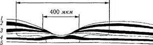 Рис. 3.6.49. Схема строения области центральной ямки сетчатой оболочки: / — внутренняя пограничная мембрана; 2 — слой ганглиозных клеток; 3 — внутренний ядерный слой; 4 — наружный ядерный слой; 5 — пигментный эпителий сетчатой оболочки Диаметр желтого пятна равняется примерно 5,5 мм. При микроскопическом исследовании этот участок сетчатки идентифицируется на основании трех основных критериев: