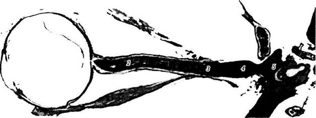 Рис. 3.7.1. Топография зрительного нерва (по Hogan, Zimmerman, 1966): 1 — интрасклеральная часть зрительного нерва; 2 — внутриглазничная; 3 — внутриканальцевая; 4 — внутричерепная; 5 — зрительный перекрест (хиазма)