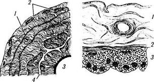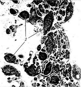 Рис. 3.8.26. Электроннограмма (малое увеличение) двухслойного пигментного эпителия радужной оболочки: / — дилятатор зрачка; 2 — передний слой пигментного эпителия; 3 — задний слой пигментного эпителия; 4 — сосуд стромы / — дилятатор зрачка; 2 — передний слой пигментного эпителия;