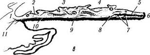 Рис. 3.8.6. Схематическое изображение особенностей анатомического строения радужной оболочки: а —передняя поверхность радужки (/ — цилиарные крипты; 2 — цилиарная зона; 3 — зрачковая зона; 4 — крипта); б — строение радужки в прикорневой области (большое увеличение) (/ — строма; 2 — дилятатор; 3 — пигментный эпителий); в — строение радужки и отношение ее к ресничному телу (/ — корень радужки; 2 — цилиарная крипта; 3 — борозда сокращения; 4 — крипта; 5 — сфинктер; 6 — зрачковый край; 7—шпора Фукса; ■5—шпора Михельса; 9 — пигментый эпителий; 10 — дилятатор; // — шпора Грюнерта) контакт может привести к прилипанию пигментных клеток радужки к капсуле хрусталика и формированию задних синехий. При нарушении положения хрусталика (суб-люксация, дислокация) или его удалении радужка отклоняется назад в плоскость корня радужки. В этих случаях передняя камера становится более глубокой и радужка дрожит при движении глаза (иридодонез). Основную толщу радужной оболочки составляет строма, которая имеет мезенхимное происхождение. В анатомическом смысле некоторые авторы выделяют поверхностные и глубокие слои стромы. Поверхностный (пограничный) слой стромы более короткий и распространяется от корня радужки до так называемого «воротничка» (рис. 3.8.7, см. цв. вкл.). «Воротничок» виден на передней поверхности радужки в виде зубчатой линии, расположенной на определенном расстоянии от зрачкового края. Считают, что передний мезенхимальный слой представляет собой остатки сосудистой зрачковой мембраны, хорошо развитой в эмбриональном периоде. В связи с характером расположения сосудов в эмбриональном периоде поверхностный слой стромы имеет радиальное трабекулярное строение. Именно этот слой определяет степень пигментации радужки (рис. 3.8.7, 3.8.8, см. цв. вкл.). Глубокий слой стромы распространяется от корня радужки до зрачкового края. В светлых радужках глубокий слой имеет волокнистое строение с радиальным распространением пучков волокон. Этот слой слабо соединен с поверхностным слоем. По этой причине при сокращении радужной оболочки происходит как бы скольжение между ними, в результате чего «воротничок» приближается к зрачковому краю. Цвет радужки обусловлен количественным содержанием в ее строме меланоцитов и является наследуемым признаком. Коричневая радужка наследуется доминантно, а голубая рецессивно. У большинства новорожденных радужная оболочка голубая, поскольку увеаль-ный тракт в это время слабо пигментирован. На 3—6-м месяце жизни у многих радужка темнеет, поскольку число меланоцитов и степень их пигментации увеличивается. Если строма радужки бедна пигментированными клетками, радужка имеет голубой цвет (рис. 3.8.7, 3.8.8, см. цв. вкл.). У альбиносов отсутствуют мела-носомы не только в стромальных меланоцитах, но и в клетках пигментного эпителия. Радужка при этом розовая. У некоторых людей имеются различия в степени пигментации правого и левого глаза. Это состояние называется гетеро-хромией. Меланоциты радужной оболочки являются источником развития доброкачественных и злокачественных меланом. Перед тем как остановиться на микроскопическом строении радужной оболочки, необходимо описать макроскопическое строение ее передней и задней поверхностей. На передней поверхности различают уже упомянутый «воротничок», крипты Фукса, брыжи зрачкового кр