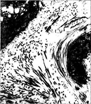 Рис. 3.8.13. Фазово-контрастная микроскопия среза стромы радужной оболочки (по Fine, Yanoff, 1972): видны пучки коллагеновых волокон (в верхнем правом углу коллагеновое волокно при большом увеличении), концентрирующиеся вокруг кровеносных сосудов и нервов