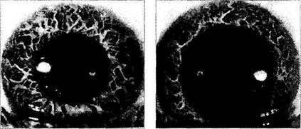 Рис. 3.8.15. Аркоподобное распределение пучков коллагеновых волокон в строме радужной оболочки Рис. 3.8.16. Изменение структуры передней поверхности радужной оболочки при расширении зрачка. Трабекулы определяют особенности пространственной организации пучков коллагеновых волокон