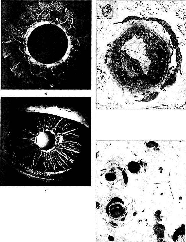 а — архитектоника сосудов переднего отдела глаза (наполнение сосудов метилметакрилатом; монтаж по Bron et at., I997) (I — передние ресничные артерии; 2 — ресничная мышца; 3 — ресничные вены); б—флюоресцентная ангиограмма сосудов радужки