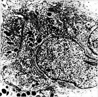 Рис. 3.8.27. Особенности ультраструктурной организации клеток переднего слоя пигментного эпителия радужной оболочки (по Hogan et al., 1971): I — ядра клеток; 2 — миофиламенты; 3 — клетка заднего слоя пигментного эпителия; 4 — межклеточные контакты между клетками переднего и заднего слоя эпителия; 5—цитоплазматичес-кие отростки клеток, распространяющиеся в строму радужки и содержащие миофиламенты; 6 — базальная мембрана, окружающая мышечную часть клеток Цитоплазма эпителиоцитов выполнена большими меланиновыми гранулами (сферичные имеют диаметр 0,8 мкм, а овоидные — 0,5— 1,3 мкм). Эти гранулы существенно отличаются от более мелких неправильно овальной формы меланиновых гранул стромальных меланоцитов радужки. Клетки заднего слоя пигментного эпителия радужки сохраняют свою кубовидную форму практически на всем протяжении, за исключением прикорневой области, т. е. в области формирования дилятатора — второй гладкой мышцы радужки. Пирамидальную форму эпителиальные клетки приобретают лишь в ямках и складках задней поверхности радужки. При этом высота их колеблется от 36 до 55 мкм, а ширина — от 16 до 25 мкм. По периферии радужки клетки постепенно депигментируются по мере перехода в эпителий ресничного тела. При использовании электронной микроскопии базальная мембрана в основании клеток пигментного эпителия имеет обычное строение. Боковые поверхности клеток отдают интерди-гитации, погружающиеся в соседнюю клетку. Несмотря на наличие между соседними клетками довольно большого количества десмосом, между клетками сохраняется межклеточное пространство шириной 200 мкм. Хорошо известно, что задний и передний слои пигментного эпителия радужки легко отделяются друг от друга. При этом образуются псевдокисты. Пигментные клетки эпителия радужки обладают многими функциями, некоторые из которых хорошо изучены, но многие неизвестны. Недавно обнаружена способность эпителиоцитов радужки, как и пигментного эпителия ресничного тела, ингибировать активность Т-лим-фоцитов, что, возможно, предотвращает развитие апоптоза в условиях различных патологических состояний [1213].