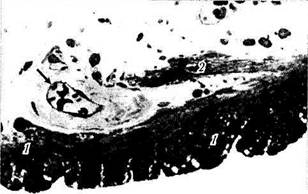 Рис. 3.8.21. Зрачковый край радужной оболочки: вокруг сфинктера зрачка (/) определяется скопление интенсивно пигментированных «глыбистых» клеток (2)