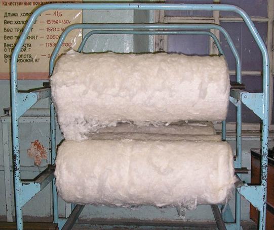 От вертикального разрыхлителя хлопковое волокно через конденсор подается на автоматический распределитель, затем к трепальным машинам. Быстроходный конденсор предназначен для пневмотранспортирования волокна с частичным удалением из него пыли, пуха и сорных примесей. Он состоит из двух камер, отдельных между собой перегородкой. В первой камере устанавливается сетчатый барабан, который размещен поперек трубопровода и связывает место отбора хлопка с местом его вывода; во второй камере – вентилятор. Вентилятор отсасывает воздух через торцы сетчатого барабана. За счет создавшегося разряжения хлопок поступает в конденсор и обтекает наружную поверхность сетчатого барабана, а пыль, пух и другие мелкие сорные примеси проходят через отверстия барабана и вместе с воздухом вентилятором подаются на очистку в рукавные фильтры. Наряду с большой частотой вращения ротора вентилятора конденсор имеет высокую частоту вращения сетчатого барабана, что обеспечивает перемещение волокна без присоса его к поверхности сетчатого барабана. Автоматический распределитель служит для равномерного распределения волокна по трепальным машинам. Трепальная машина (рис. 6)предназначена для очистки хлопкового волокна от остатков жестких сорных примесей и для формирования холста – рулона, сложенного из уплотненного слоя хлопка. Трепальная машина состоит из трех последовательно расположенных секций: секция ножевого барабана (с приемным бункером), секцией планового трепала и секцией игольчатого трепала с холстообразующим прибором. Технологическая схема секции ножевого барабана полностью совпадает с технологической схемой горизонтального разрыхлителя. Однако чистящая способность секции выше, так как производительность трепальной машины в два раза меньше. Во второй секции производится ударное воздействие на хлопок планочными билами (трепалами) и его растрепывание. В третьей секции под воздействием игольчатого трепала производится растаскивание хлопка на мелкие клочки. Трехбильные трепала вращаются со скоростью 1000-1500 об/мин и наносят удары по хлопку. Под действием тяги воздуха и центробежной силы клочки хлопка оседают на поверхности сетчатых барабанов, образуя сравнительно равномерный слой волокна. Для превращения равномерного слоя разрыхленного хлопка в холст служит холстовой прибор. После обработки хлопка в трепальных машинах полученный холст (рис. 7) в виде рулонов направляют в приготовительный цех, где располагаются чесальные, ленточные и ровничные машины.