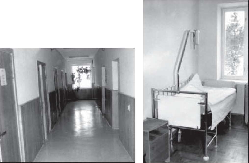 27-30 м3, що при природному або штучному повітрообміні дозволяє в приміщенні створити концентрацію вуглекислоти не більше 0,1 %, швидкість руху повітря повинна бути 0,100,15 м/с при вологості повітря 50-55 %. Це оптимальні умови для нормальної життєдіяльності людини. Вказані параметри можна легко регулювати за допомогою кондиціонера. Для зв'язку чергового персоналу з хворими в палатах повинна бути звукова або світлова сигналізація. Коридори повинні бути просторими, затишними. На підлогу настилають лінолеум. У хірургічному відділенні проводять вологе прибирання з додаванням антисептиків (хлорного вапна, хлораміну, мікробаку, сокрена і ін.). Прибирання потрібно проводити два рази на добу. Вологе прибирання у палатах розпочинають Рис. 4. Загальний вигляд палати. з видалення пилу з підвіконників,