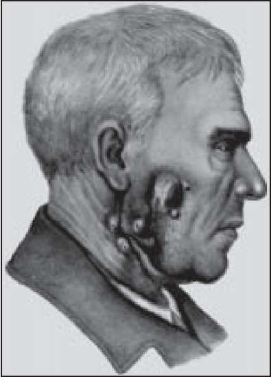 Захворювання починається повільно. В ділянці проникнення актиноміцет виникає специфічна запальна реакція, основою якої є колонія грибків, що складається з сітки тонких ниток у вигляді променів (друз). Навколо них утворюється щільний інфільтрат. Шкіра над ним набуває червоно-синюшного забарвлення. В окремих ділянках утворюється розм'якшення і прорив гною. Виникають нориці, через які виділяється рідкий гній з жовтуватими крихтами чи зернами (гранулами). У них Рис. 163. Актиномікоз, шийно- знаходять скупчення актиноміцет, що є спе- лицьова форма (за Кіршнером). цифічними елементами виділень. При бронхолегеневій формі захворювання перебігає у вигляді гострого та хронічного абсцесу легень, бронхопневмонії, плевриту. Процес може поширюватись на грудну стінку, утворювати плевральні нориці на шкірі і проникати через діафрагму в черевну порожнину. Кишкова форма актиномікозу розвивається у разі проникнення актиноміцетів через слизові оболонки травного каналу. Процес поширюється на м'язову та серозну оболонку. Запальний процес, що виникає, може симулювати гострий апендицит, пухлину сліпої кишки, кишкову непрохідність та ін. Лікування. Може бути консервативним і хірургічним. Призначають великі дози бензилпеніциліну (20 000 000 ОД через 6 год). Його можна поєднувати з стрептоміцином, ауроміцином. При шкірних формах захворювання застосовують рентгенотерапію, препарати йоду (йодид калію, йодонат, йодинол, йодопірон і ін.). Поряд із цим, проводять специфічне лікування актинолізатом (з 0,1 до 2 мл через 2-3 дні - всього до 20 ін'єкцій). З хірургічних методів застосовують розкриття та дренування гнійних порожнин; резекцію ураженої ділянки кишечника, легень й ін. Дифтерія ран — гостре інфекційне захворювання, що спричиняється коринебактеріями Е. Клебса і Ф. Лефлера, які являють собою грампозитивні паличкоподібні безспорові мікроорганізми з булавоподібними потовщеннями на кінцях. Звідси й походить назва (coryna - булава). Захворювання передається в основному повітряно-крапельним шляхом. Важливе значення у виникненні і розповсюдженні хвороби мають дифтерійні бактеріоносії. Клінічні ознаки. Дифтерія в основному уражає слизові оболонки дихальних шляхів (гортань, мигдалики, трахея), характерною ознакою є фібринозне запалення, яке поширюється на прилеглі тканини. Захворювання супроводжується сильною інтоксикацією. В кров можуть проникати і самі бактерії (бактеріемія). З хірургічної точки зору загрозу становить інфікування коринебактеріями ран (diphteria vulnerum). Зараження відбувається під час контакту з хворими або бактеріоносіями. При дифтерії рани різко змінюється її зовнішній вигляд: на поверхні з'являються сіро-жовті фібринозні нальоти, міцно спаяні з підлеглими тканинами. Рана виповнюється серозно-кров'янистими виділеннями. Шкіра довкола гіперемована, тканини набряклі. Регіонарні лімфатичні вузли збільшені. Зараження рани дифтерійними мікробами супроводжується загальною реакцією організму. Основне значення у встановленні діагнозу має виділення чистої культури дифтерії. Небезпека дифтерійного зараження полягає в тому, що такі рани дуже погано загоюються і існує небезпека попадання мікробів у кровоносне русло. Лікування. При наявності дифтерійного ураження ран хворий стає джерелом інфекції і повинен бути ізольованим. Лікування починають з 